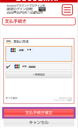 - 「支払手続き」画面で、Amazon Payで利用するクレジット情報を確認して「支払手続き確定」を選択。