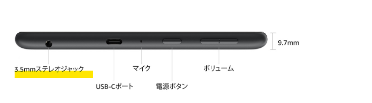 「Fireタブレット」には、3.5㎜のステレオジャックが付いているので、有線イヤホンの利用が可能です。