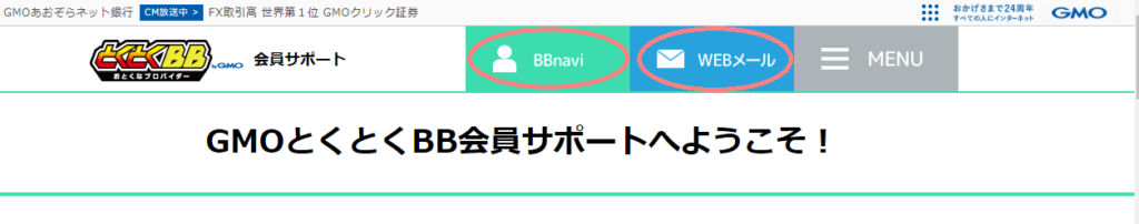 GMOとくとくBBの会員サポートページ(https://gmobb.jp/support/ )から「BBnavi」「WEBメール」にログインが可能です。