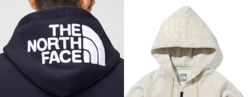 一番の特徴であるフード部分の立体刺繍ロゴは、メンズ、レディース共通。